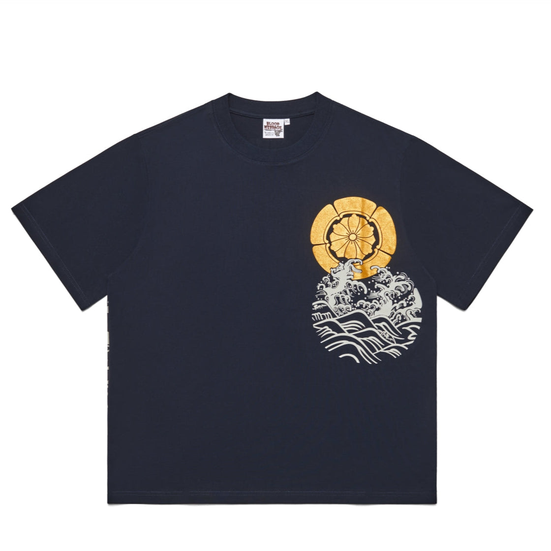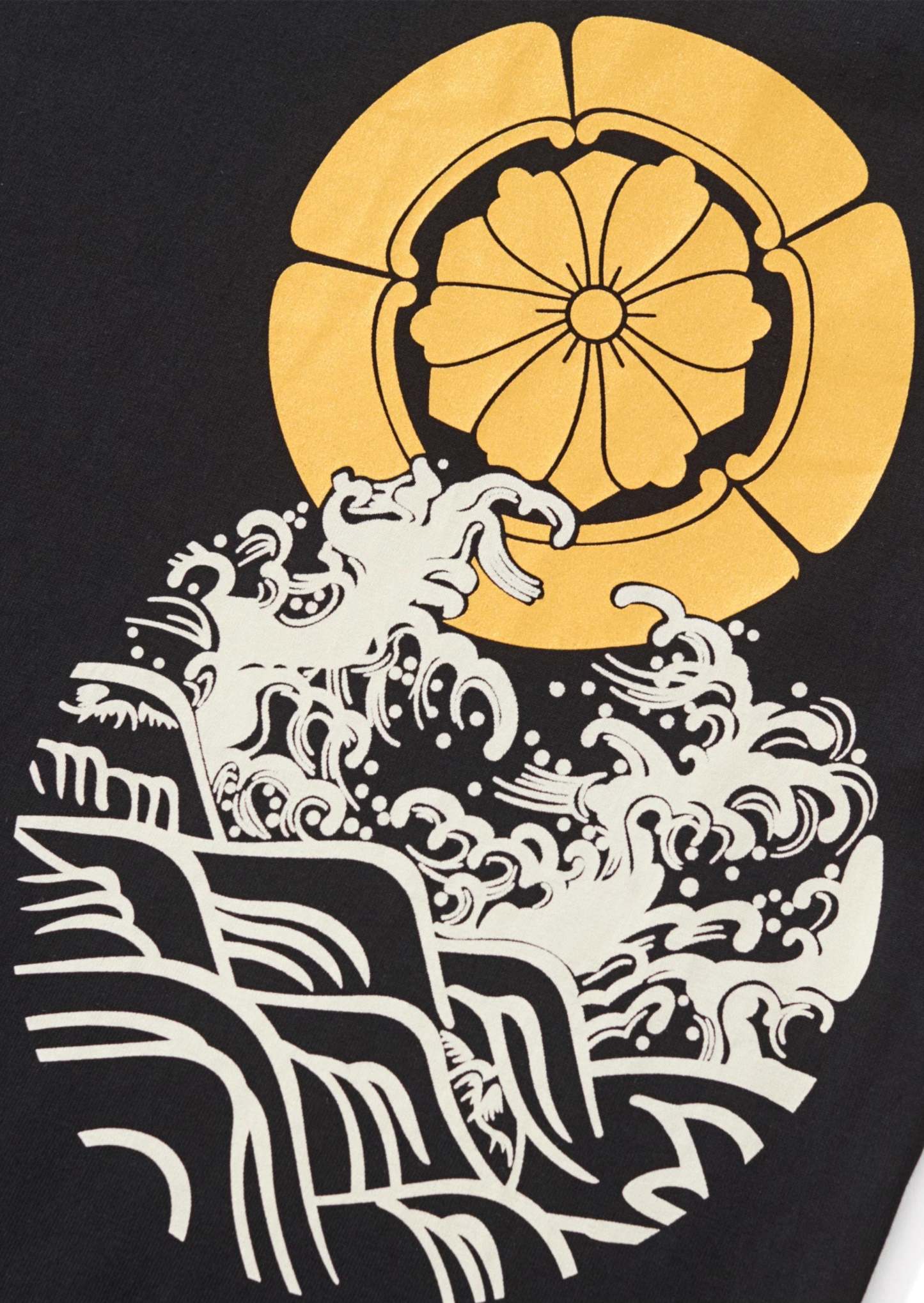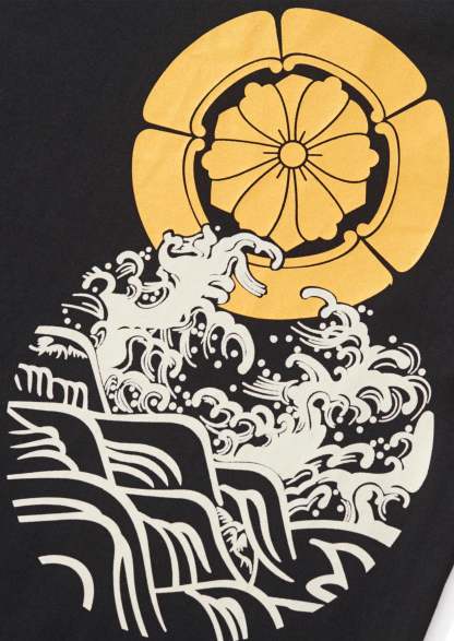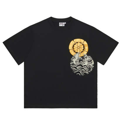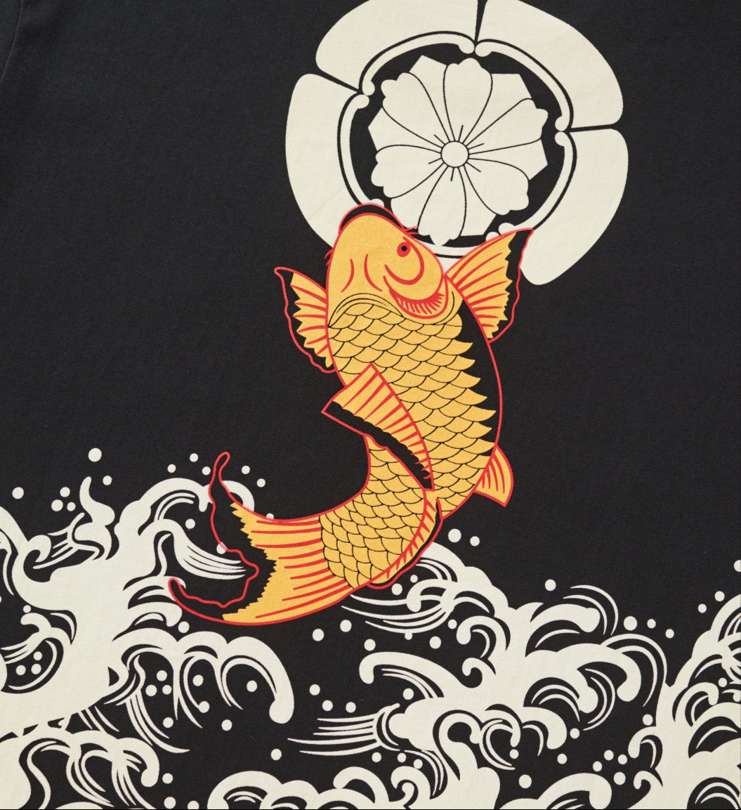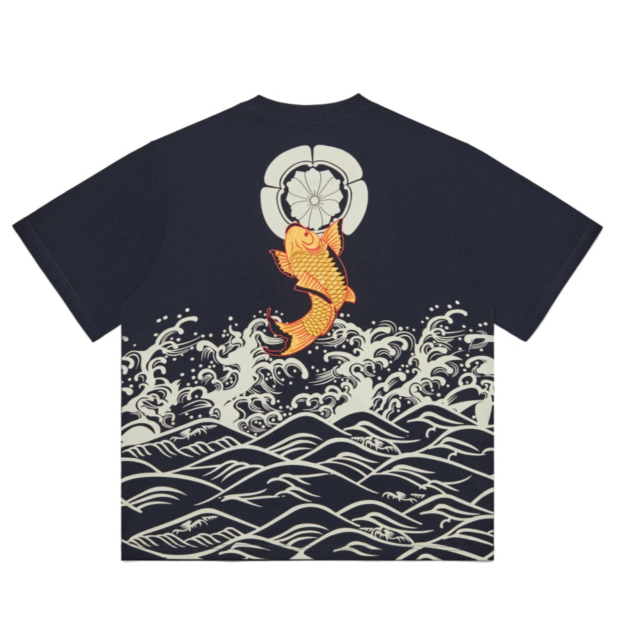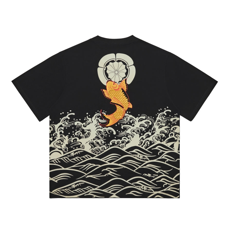 Striking Artwork: The t-shirt features a vibrant, golden koi fish swimming upwards against a backdrop of stylized waves, encapsulating the essence of overcoming adversity.