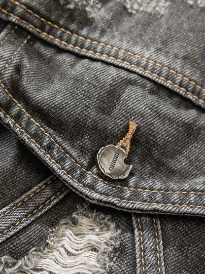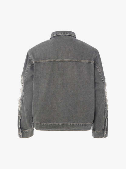 • Design Elements: Distressed patches on the chest and sleeves, faux fur accents