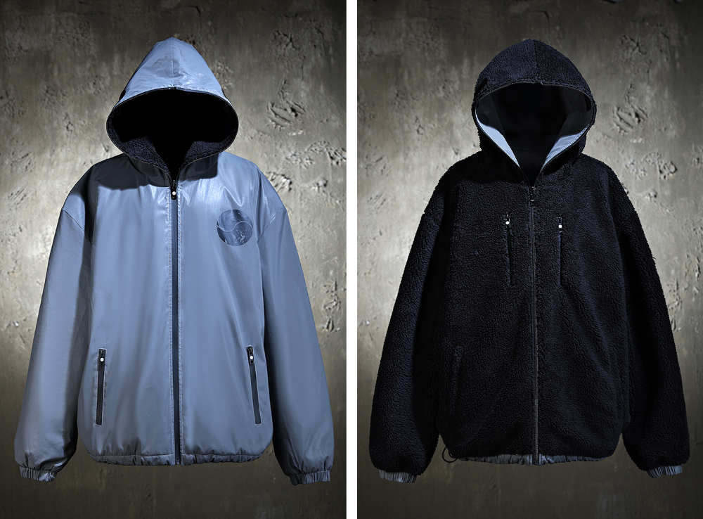 With reflective zip-up and fleece zip-upReversible hooded zip-up that can be worn on both sides without distinction