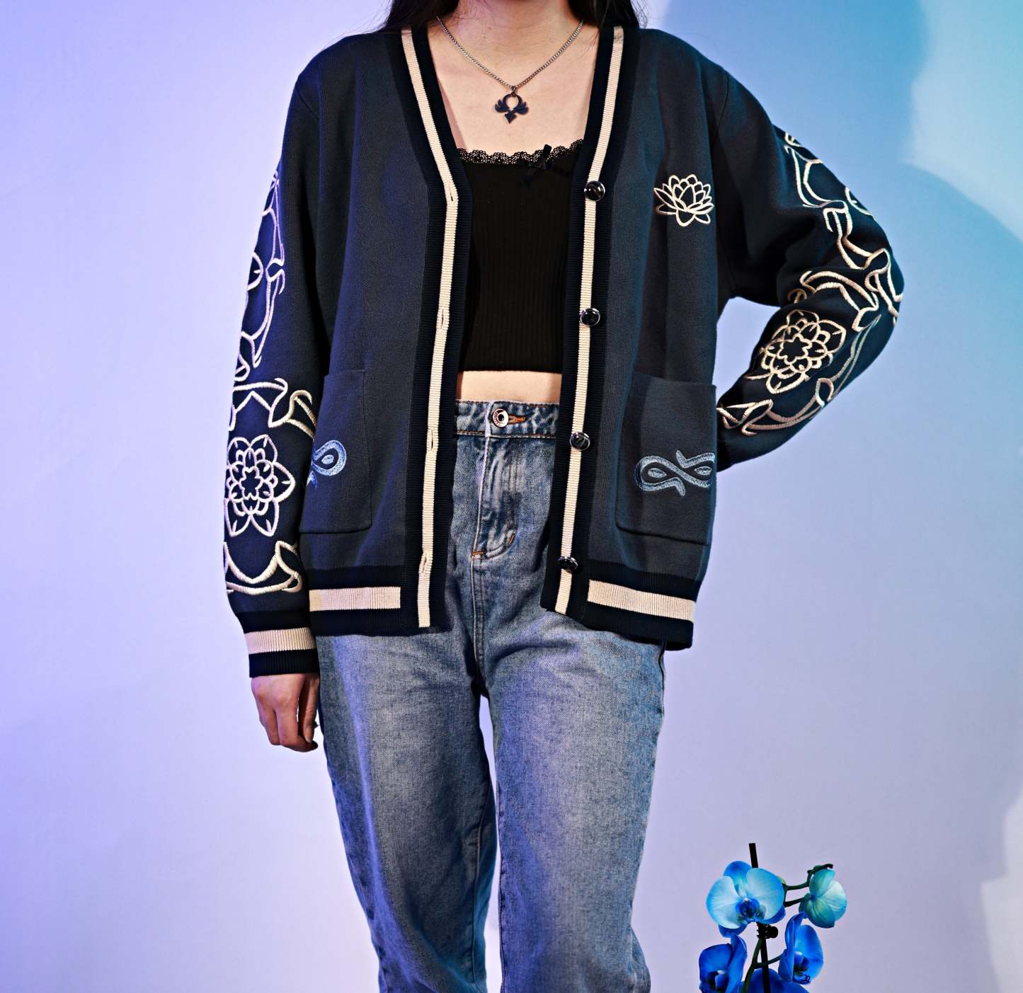 These cardigans are made from the highest quality 100% cotton yarns and feature very special design elements inspired by the favorite Genshin Impact characters you voted for. Each design does not only feature jacquard knitted patterns but also luxurious embroidered elements & custom rust free buttons. Some designs even features uniquely crafted metal pins or tassels inspired by the character.
