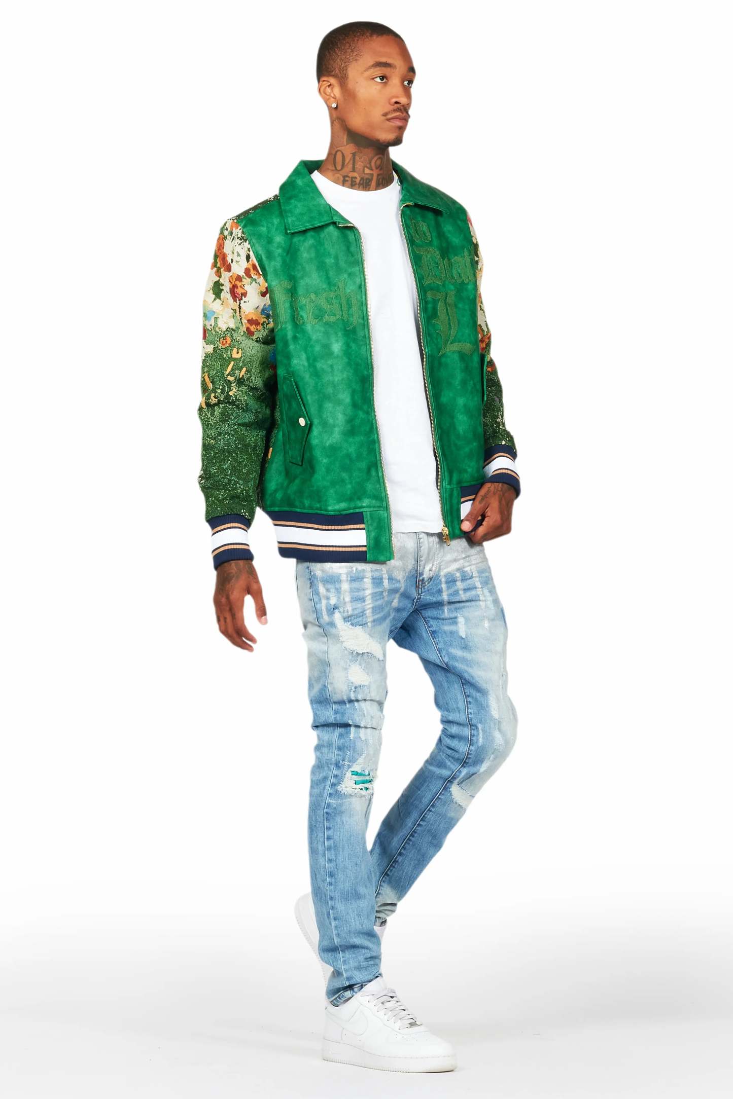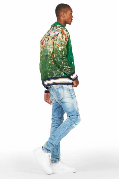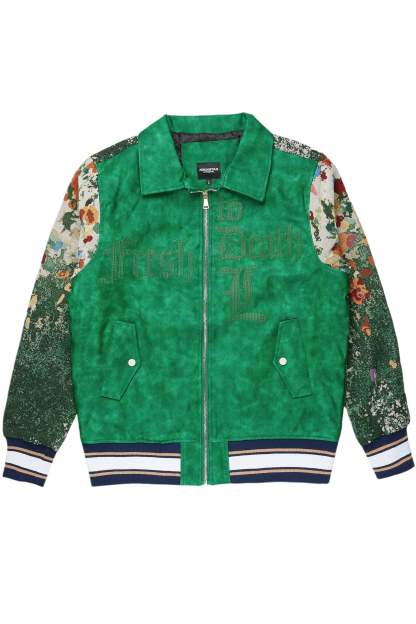 An urban tapestry jacket for men in green. Designed with organic cotton and custom tapestry designing for a must-cop style.