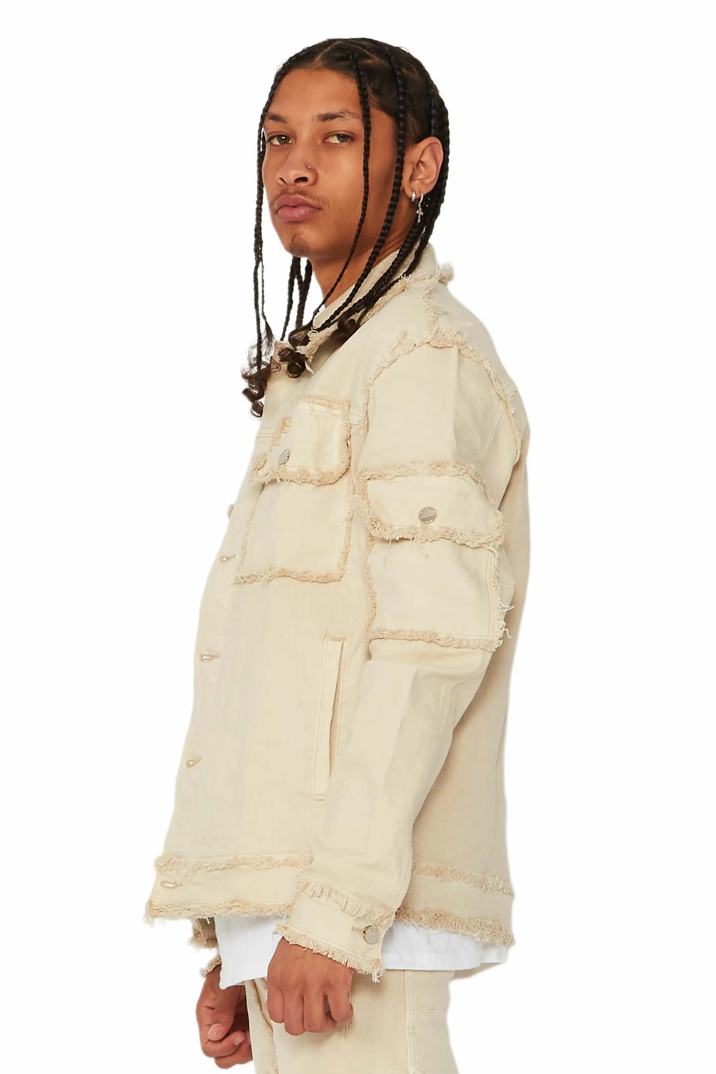 An urban denim jacket for men in beige. Designed with organic cotton and custom frayed stitch designing for a must-cop outerwear style.