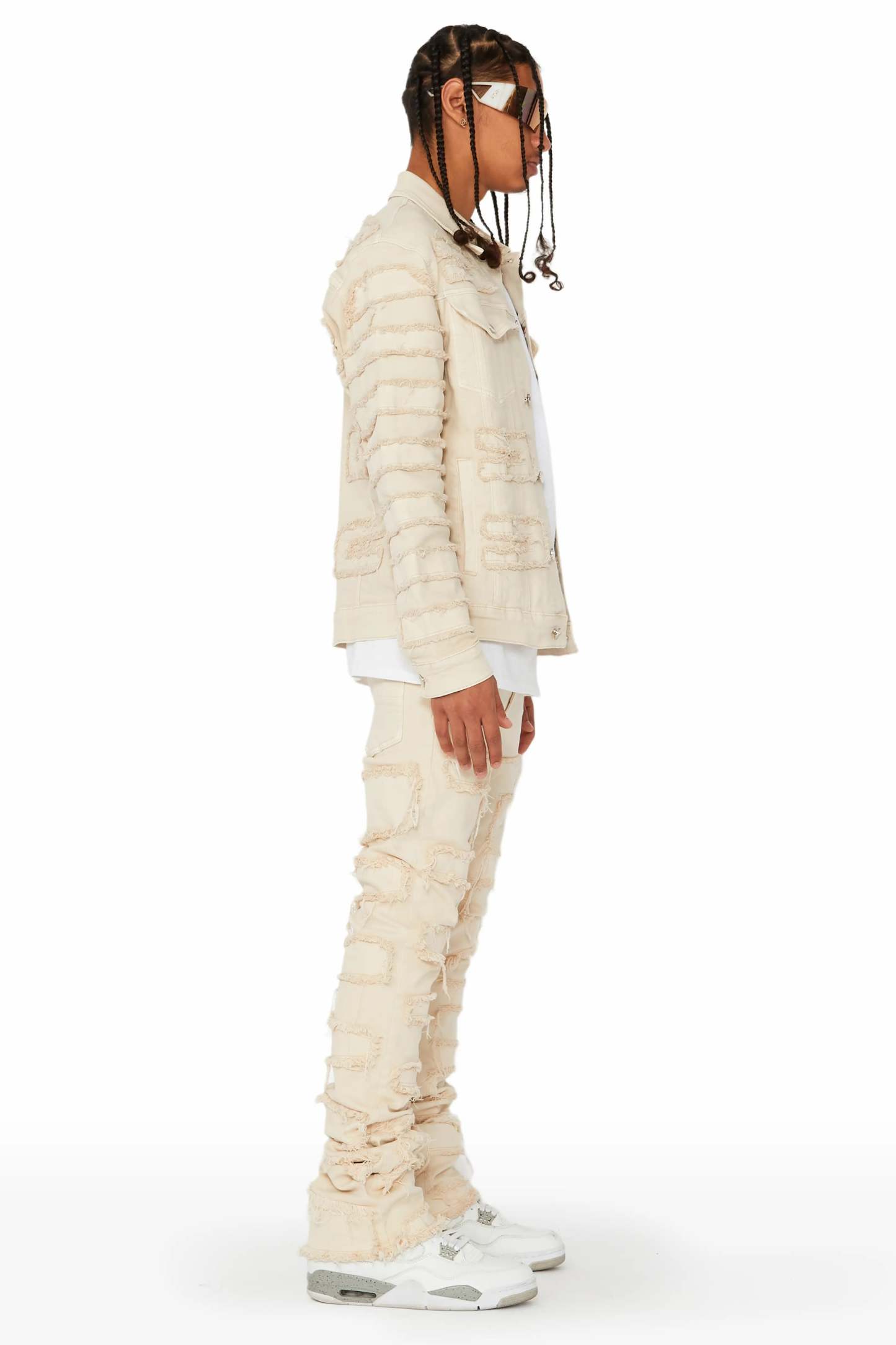 An urban denim jacket for men in beige. Designed with organic cotton and custom frayed stitch designing for a must-cop outerwear style.