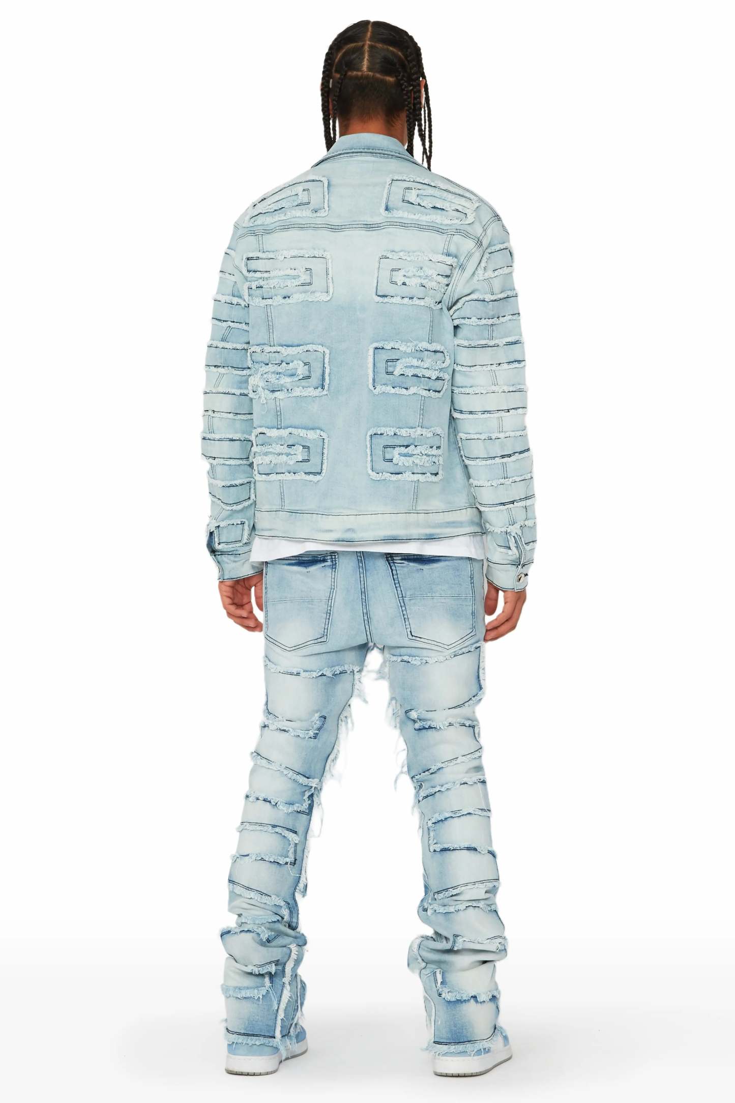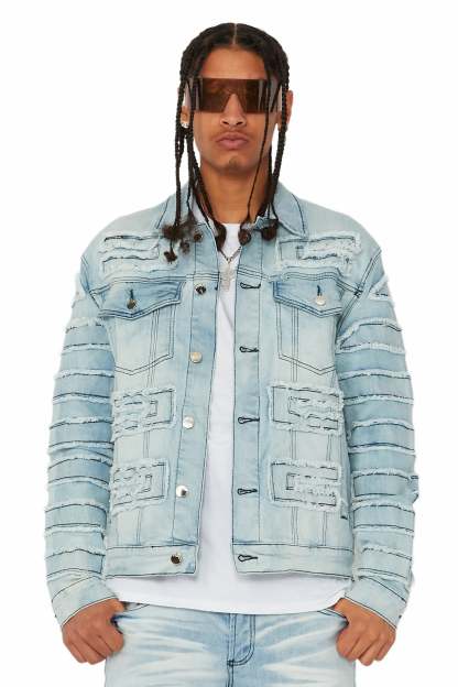 An urban denim jacket for men in blue. Designed with organic cotton and custom frayed stitch designing for a must-cop outerwear style.