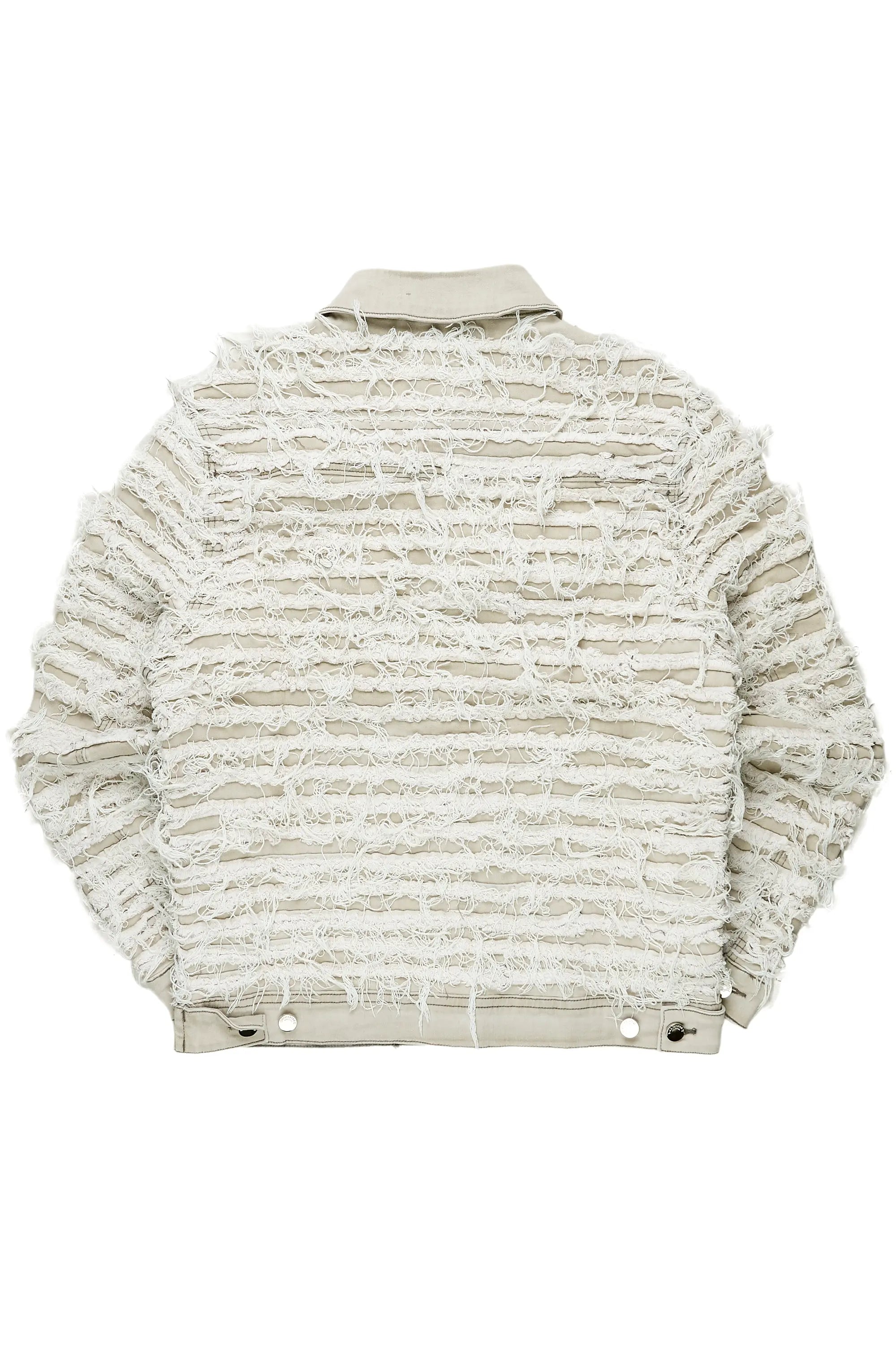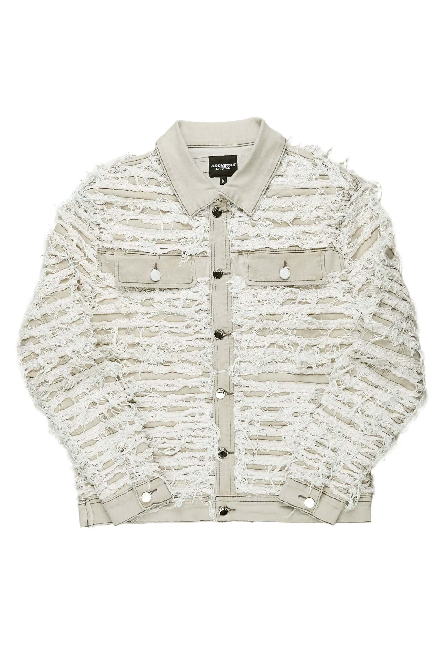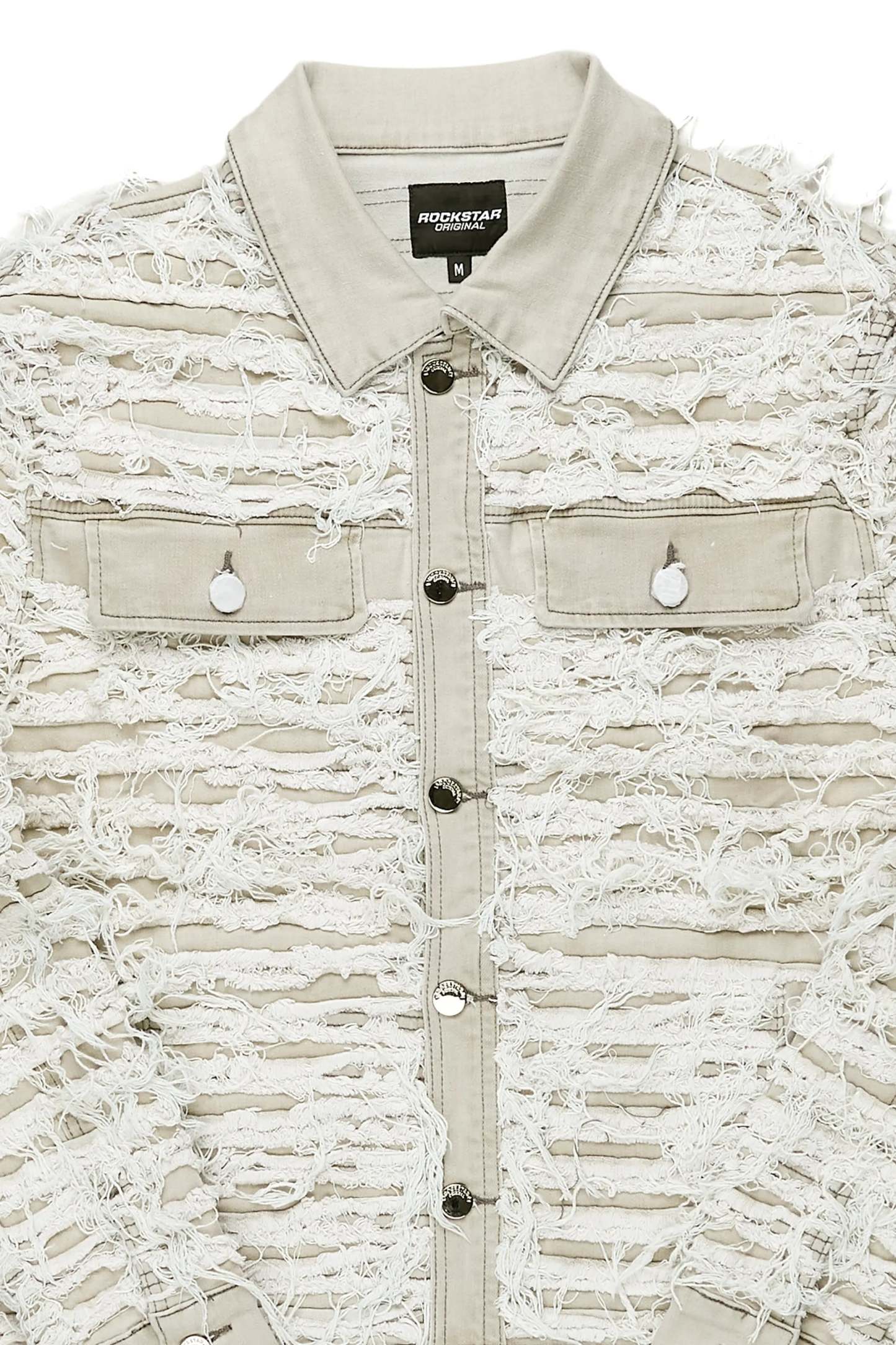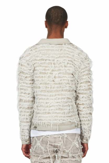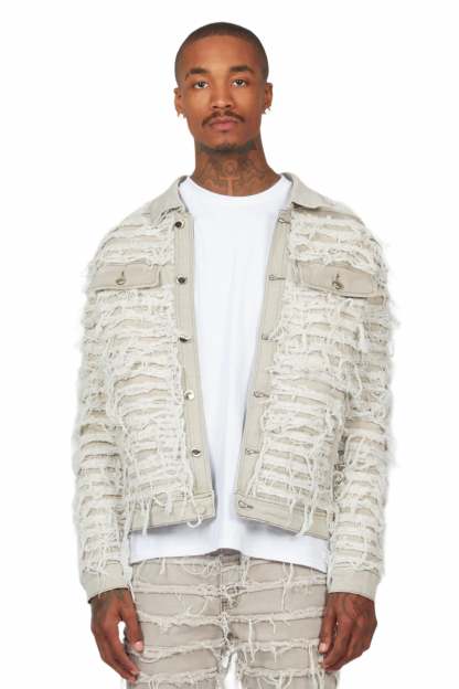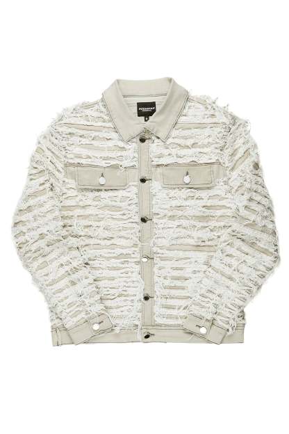 An urban denim jacket for men in grey. Designed with organic cotton and custom frayed stitch designing for a must-cop outerwear style.