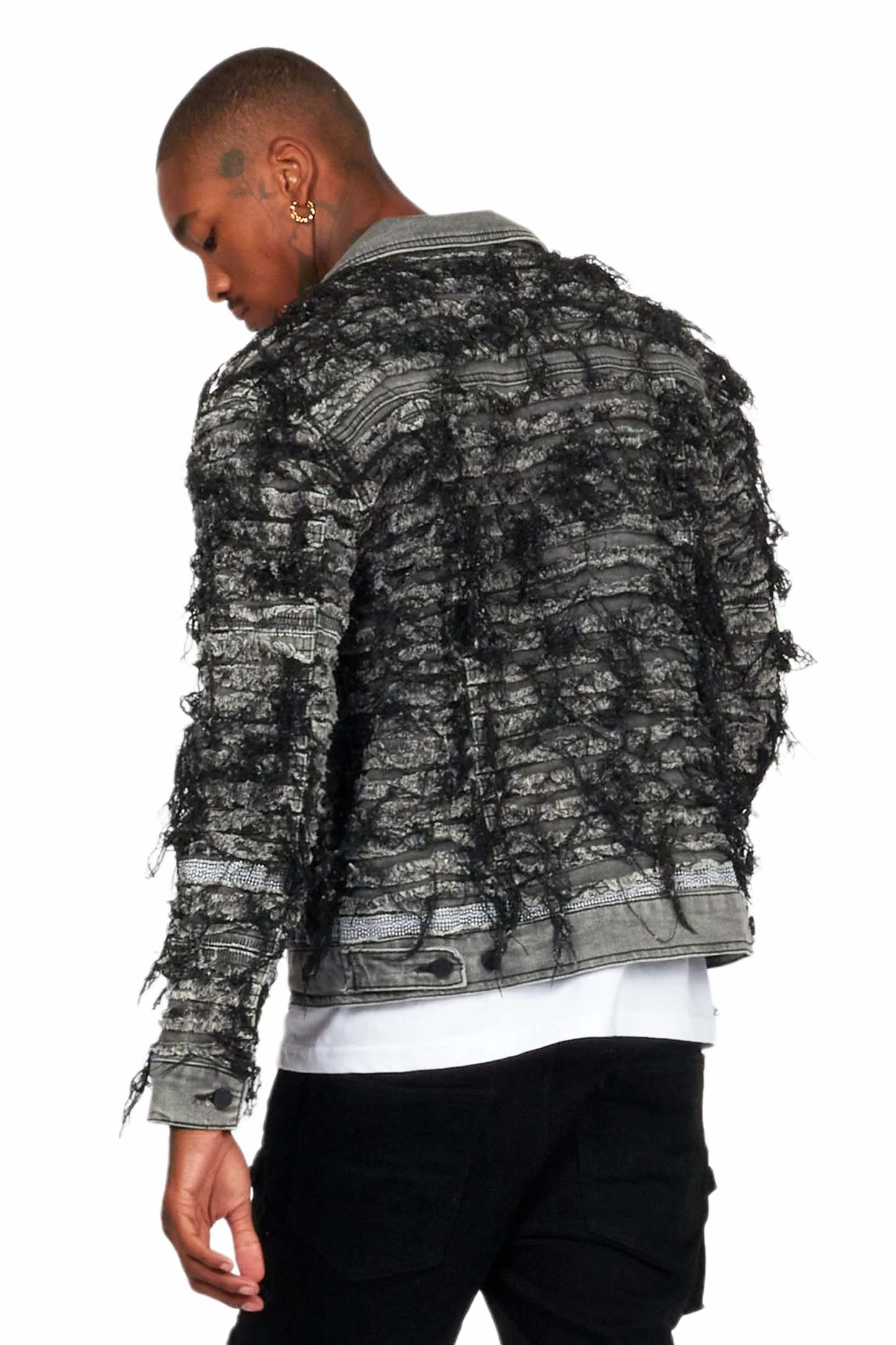 An urban denim jacket for men in black. Designed with organic cotton and custom frayed designing for a must-cop outerwear style.
