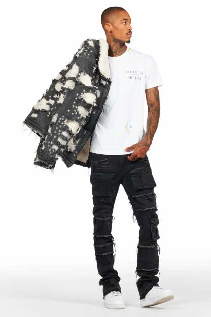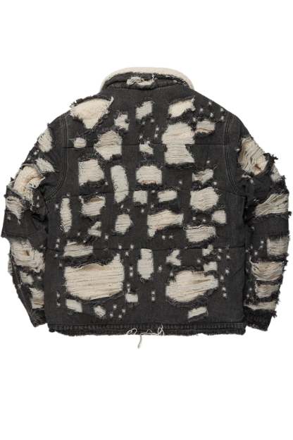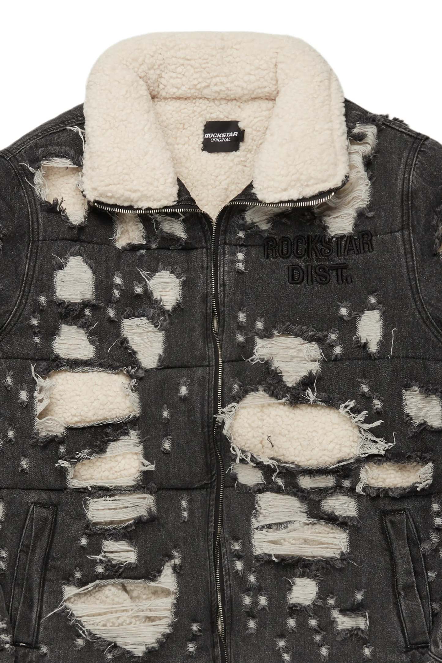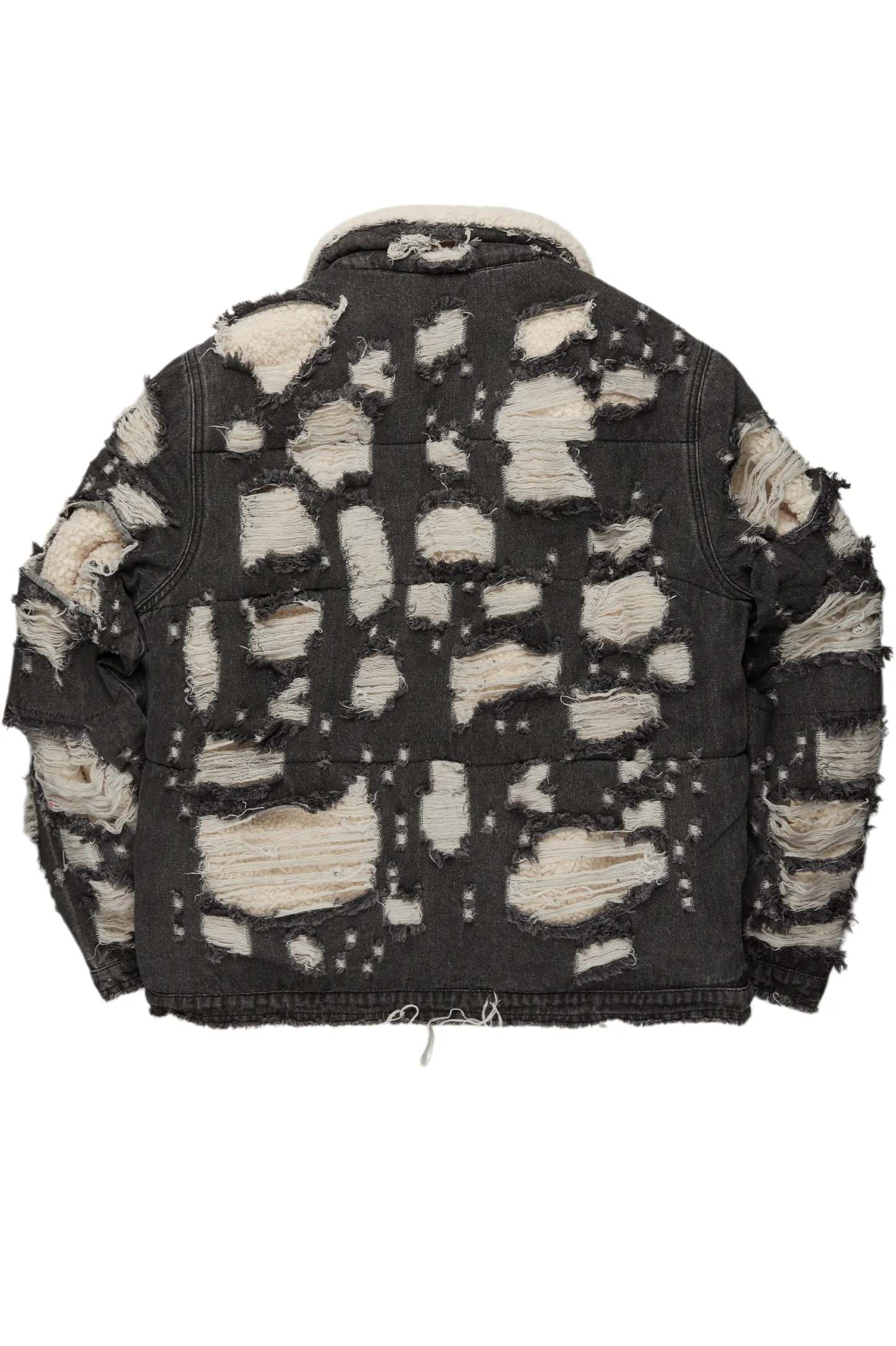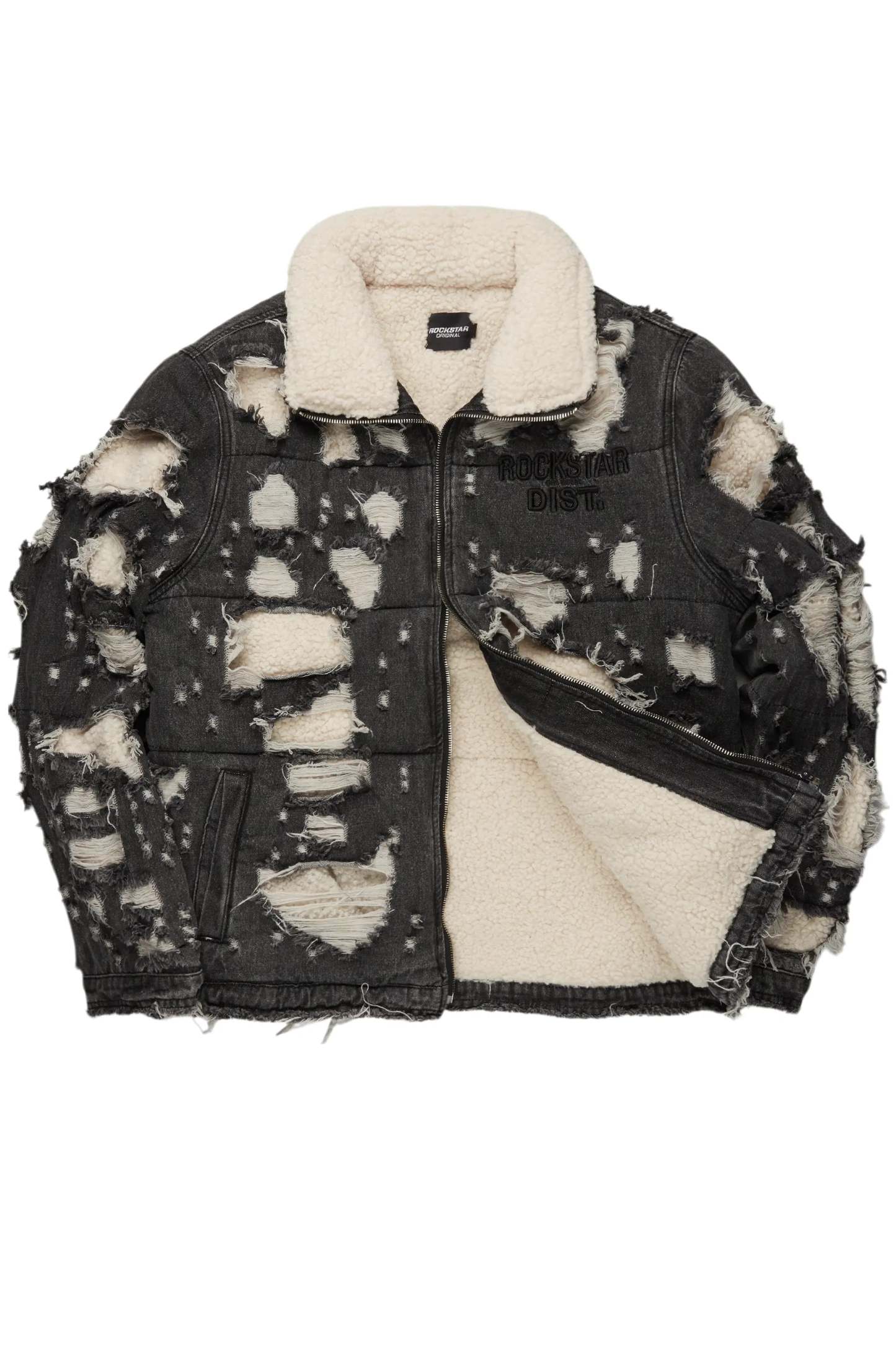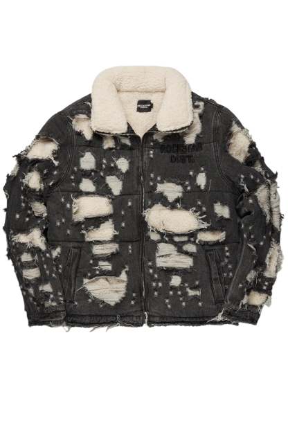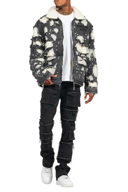 An urban denim puffer jacket for men in black. Designed with organic cotton and custom sherpa lining for a must-cop outerwear style.