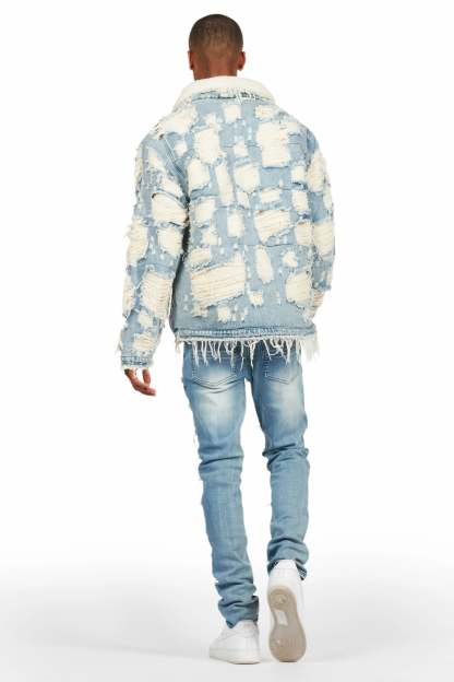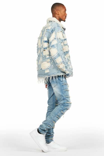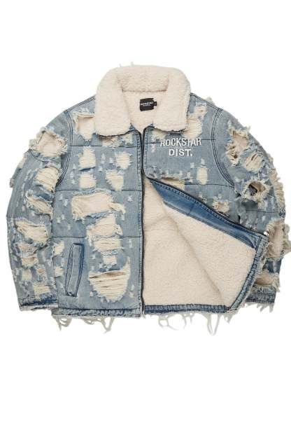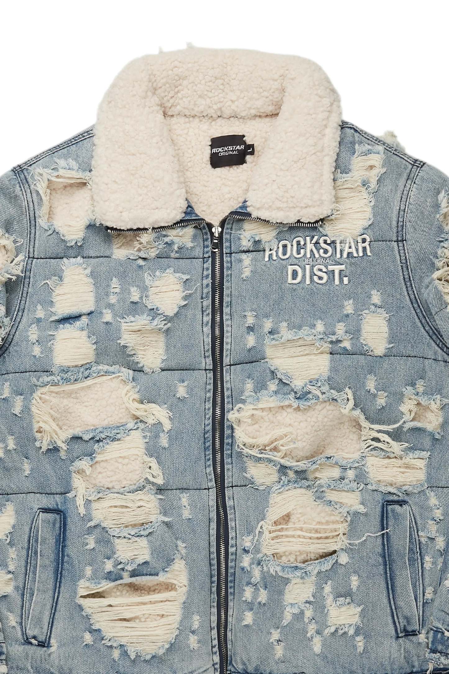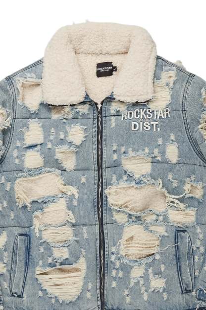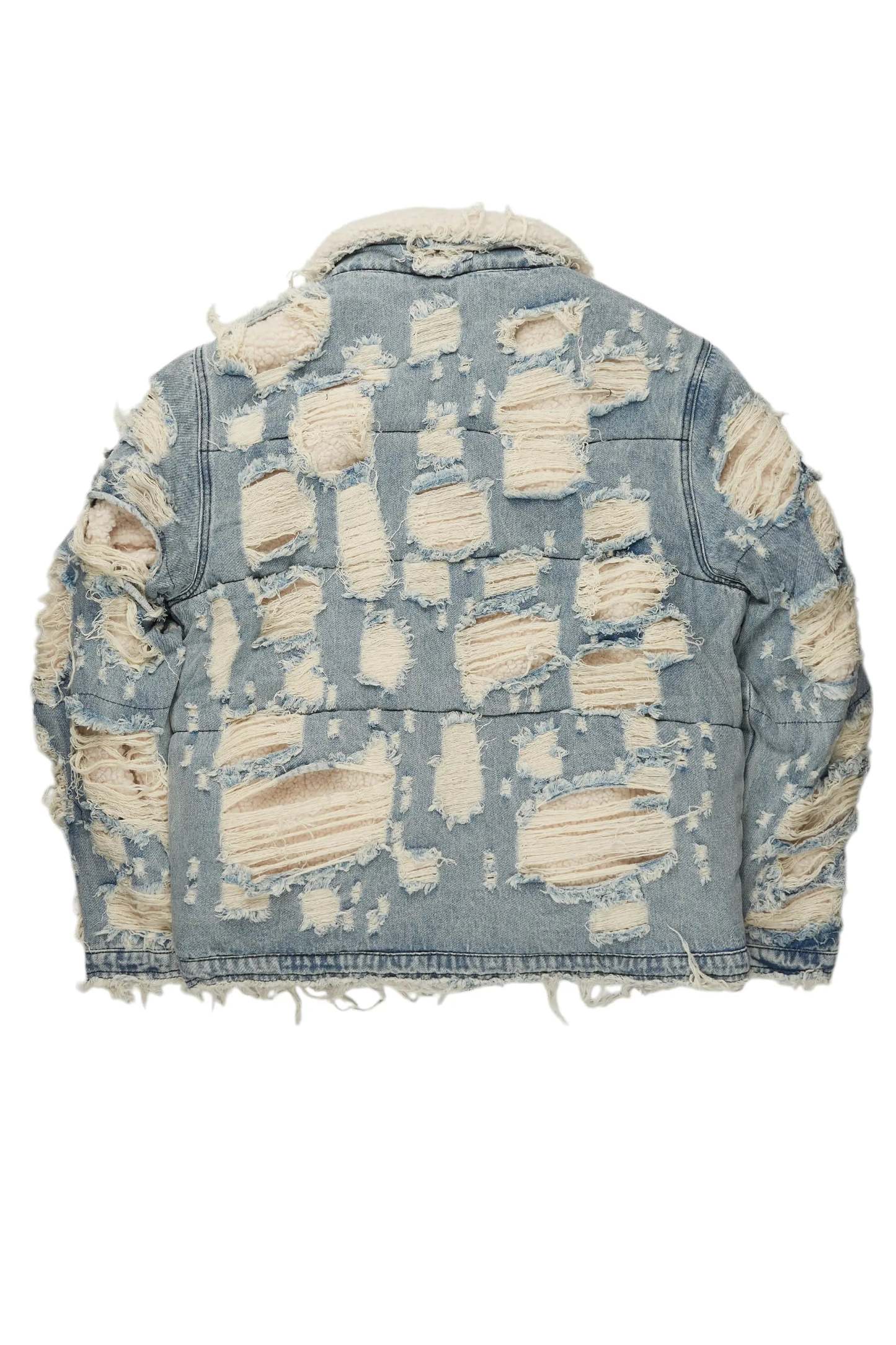 An urban denim puffer jacket for men in blue. Designed with organic cotton and custom sherpa lining for a must-cop outerwear style.