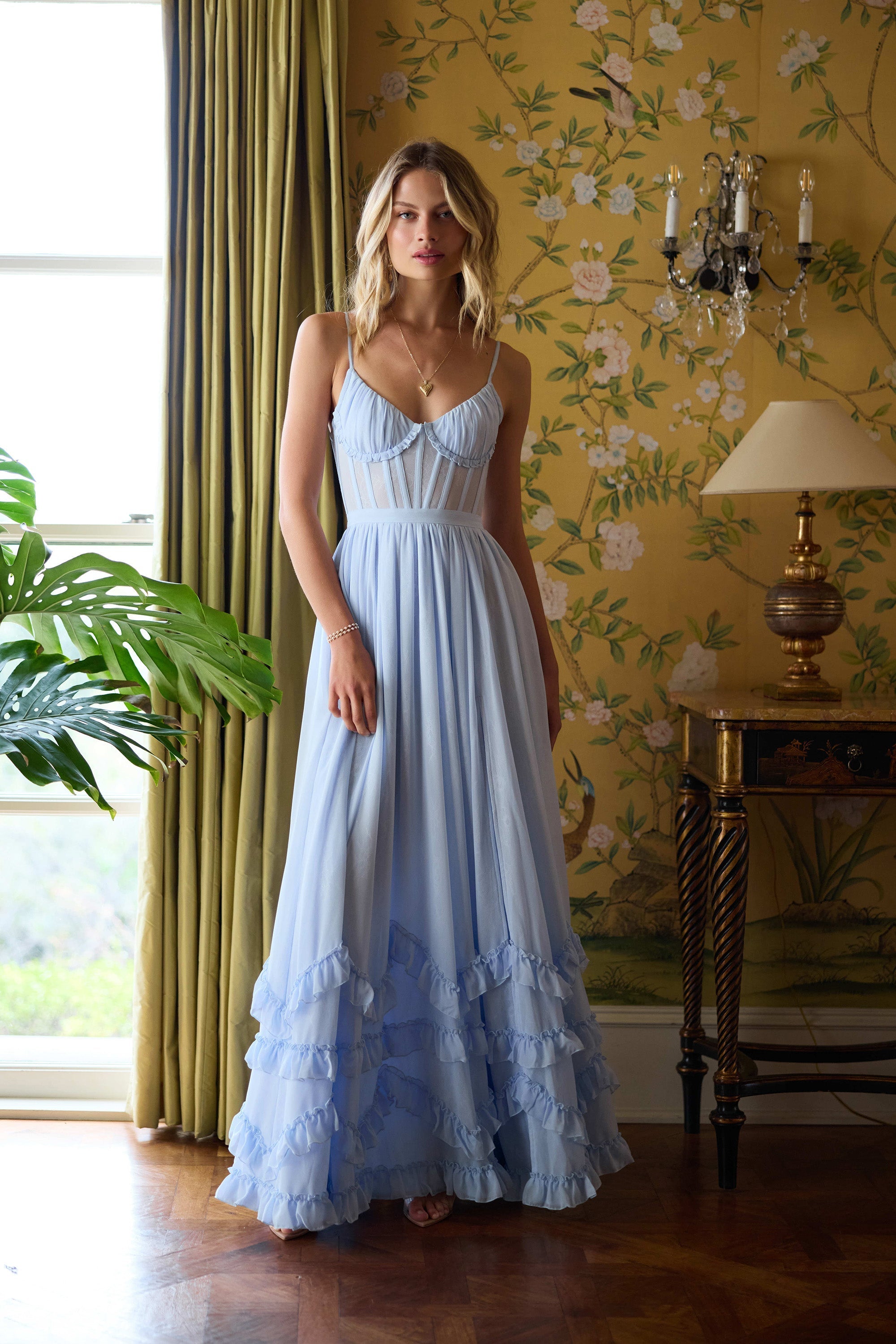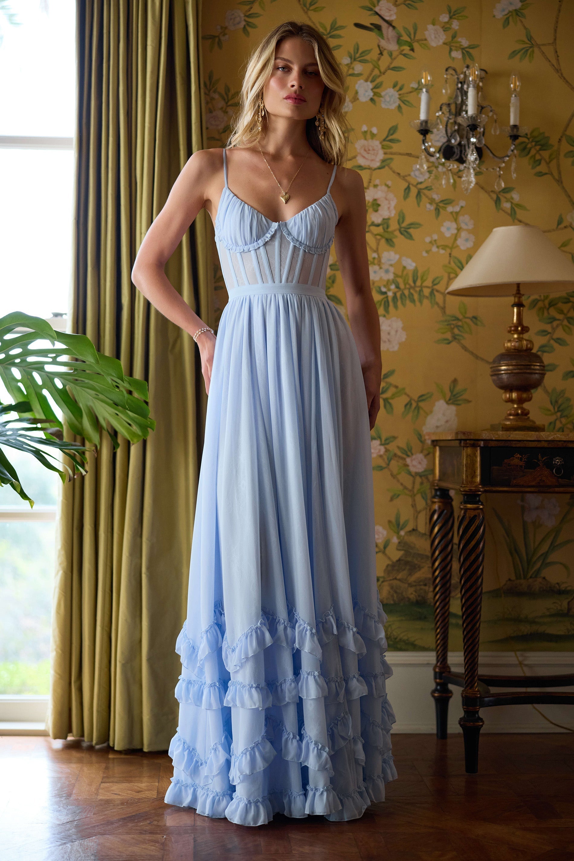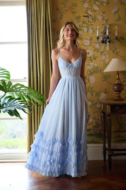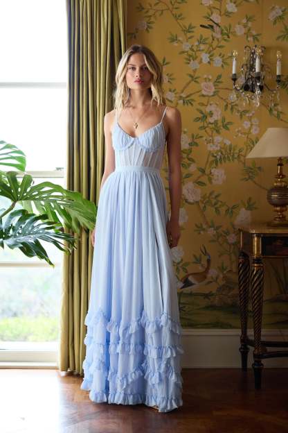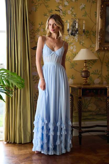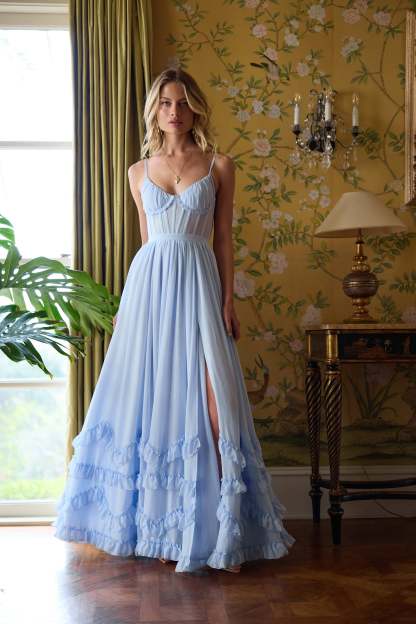 Meet Carmen! She's a stunning full-length corset gown featuring a high side front slit and adorned with delicate ruffle details at the hem. She's made in our elegant Halogen Blue chiffon over soft, subtle layers of lace and accented with a beautiful bow-tie detail at the back.