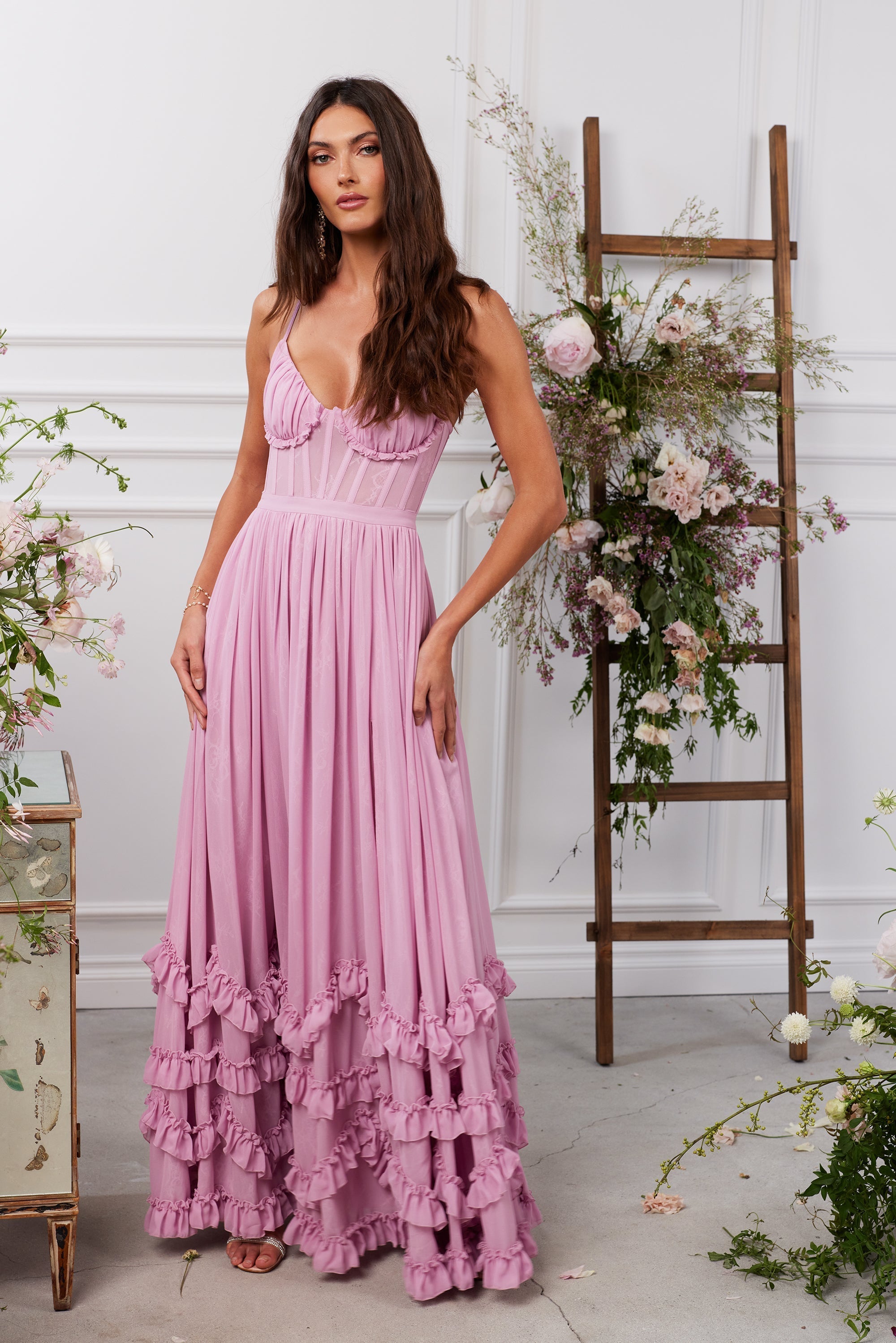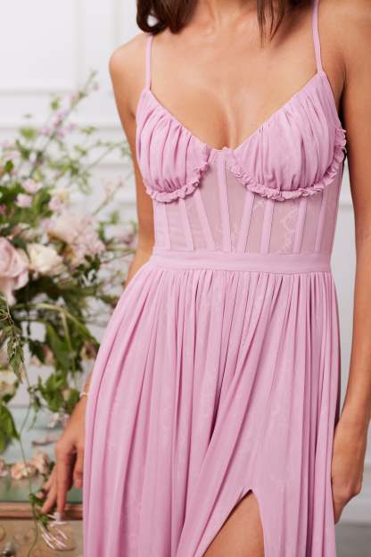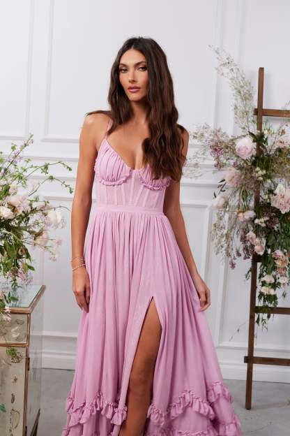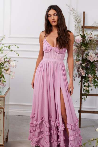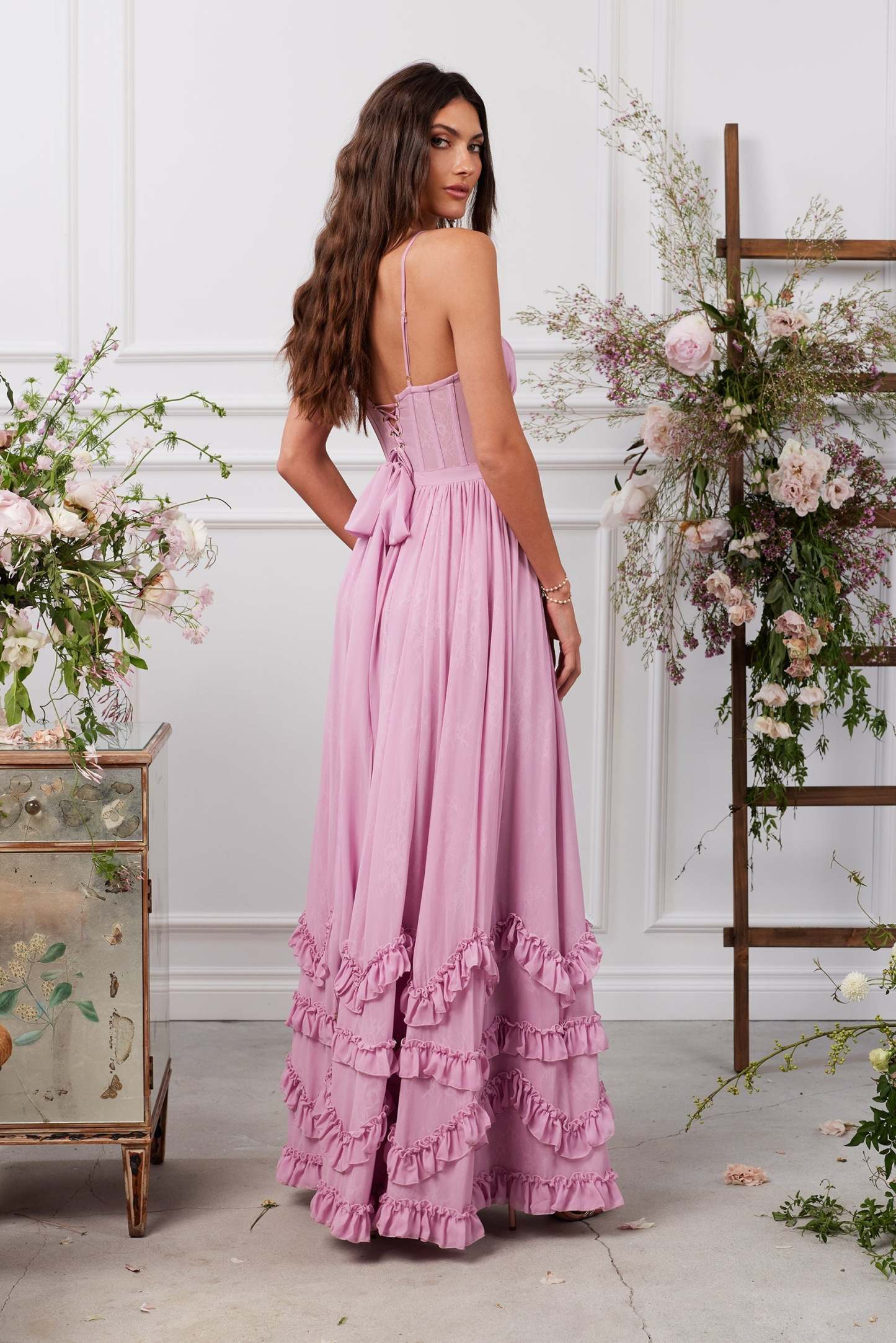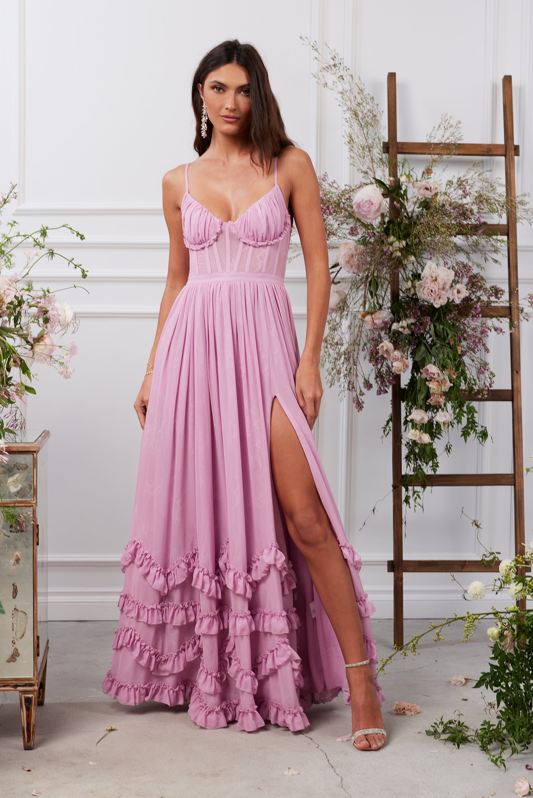 Meet Carmen! She's a stunning full-length corset gown featuring a high side front slit and adorned with delicate ruffle details at the hem. She's made from our solid Mauve Mist chiffon over soft, subtle layers of lace and accented with a beautiful bow-tie detail at the back.