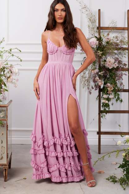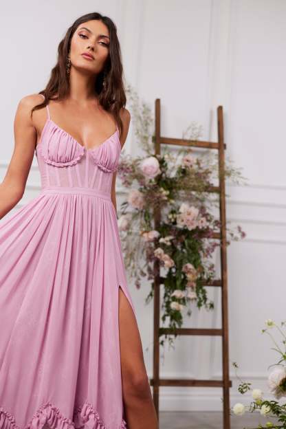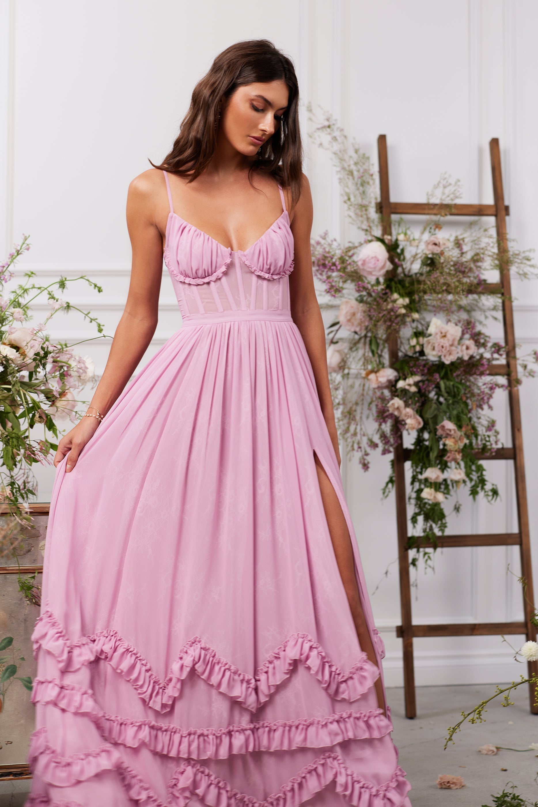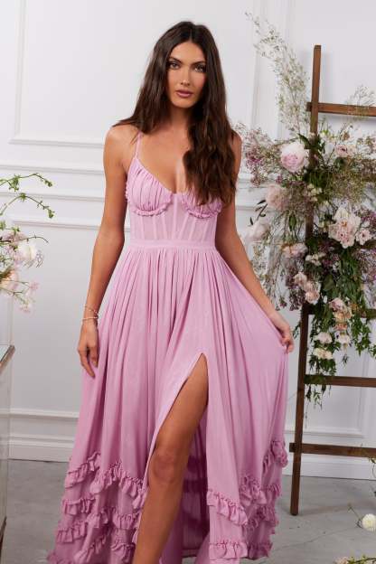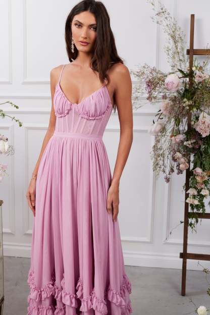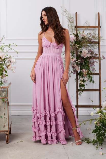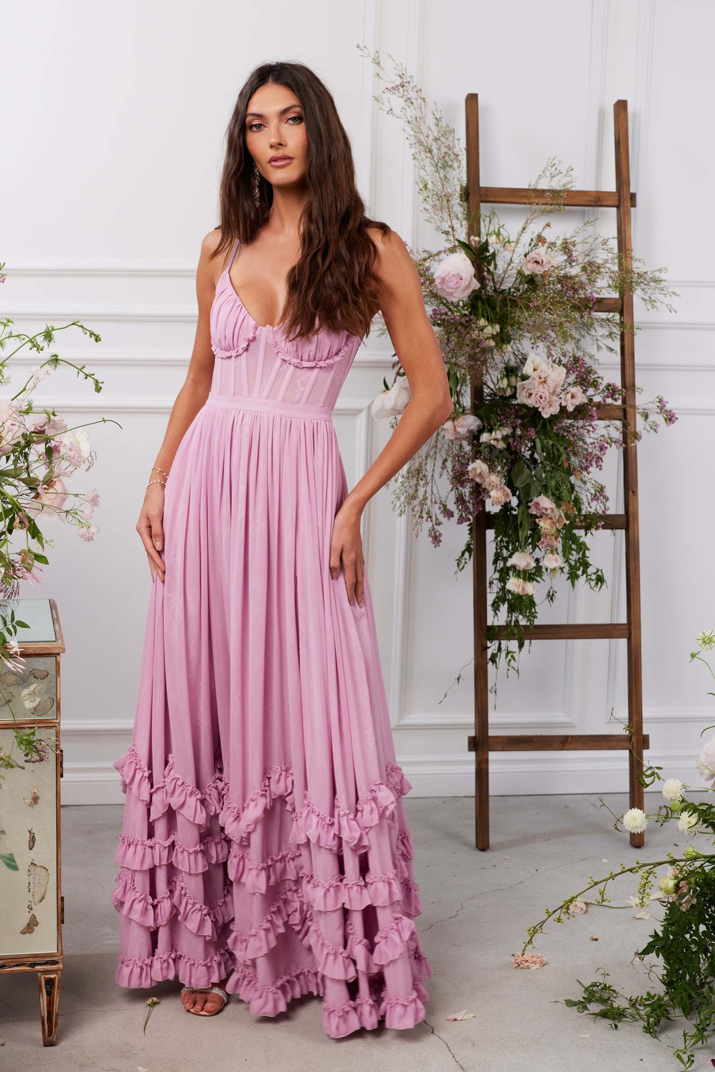 Meet Carmen! She's a stunning full-length corset gown featuring a high side front slit and adorned with delicate ruffle details at the hem. She's made from our solid Mauve Mist chiffon over soft, subtle layers of lace and accented with a beautiful bow-tie detail at the back.