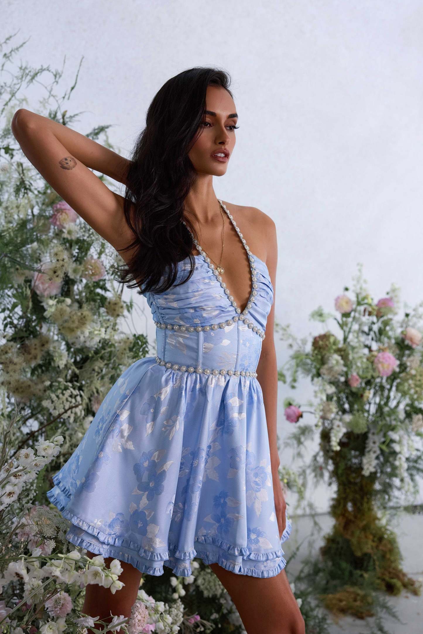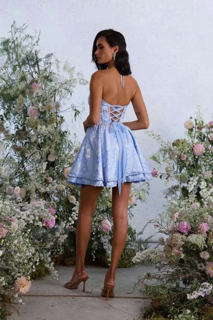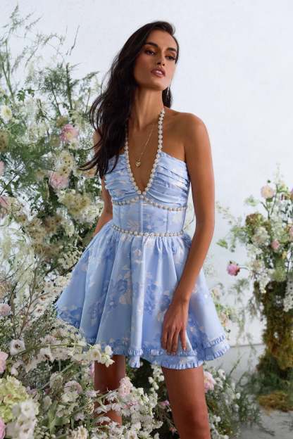 The Savannah Dress is a gorgeous halter mini dress embellished with delicate pearl and crystal beaded trim. She features a stunning corset bodice, beautifully gathered skirt tiers, delicate ruffle details, and an invisible zipper. She is made in our stunning Chambray Blue Baroque floral brocade, which features tonal blue and silver florals on a light blue background. Savannah is flouncy, flirty, and oh so sweet!