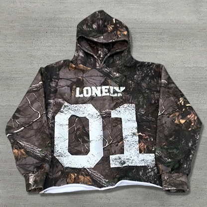 Vintage Curled Tree Camouflage LONELY Print Hoodie