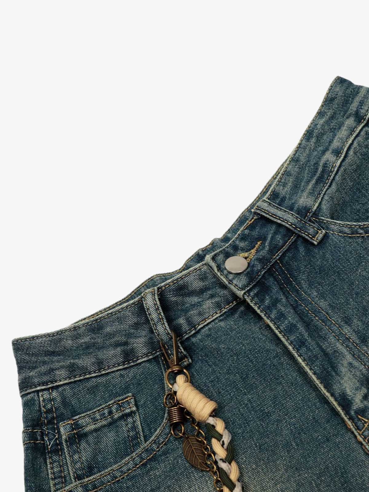 • Design Elements: Braided chain accessory, distressed patches, faded wash effect